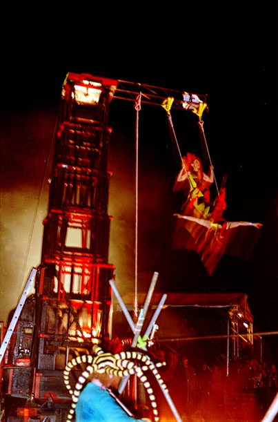 High Voltage perform swinging doubles trapeze at Cambridge Stawberry Fair in 1994 - Carol's the one standing on the trapeze!