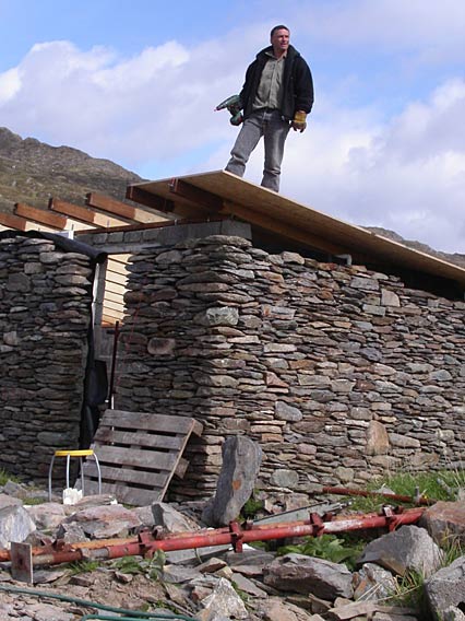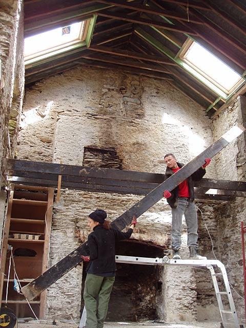 When it wasn't raining we got a roof onto the shed out back which has been rebuilt - only the gable ends were really still there, the rest had completely fallen down, so we had it rebuilt with a concrete blockwork interior and stone exterior walls. Ger, the stonemason has done a fantastic job, but he only built the walls, we have to put the roof on...